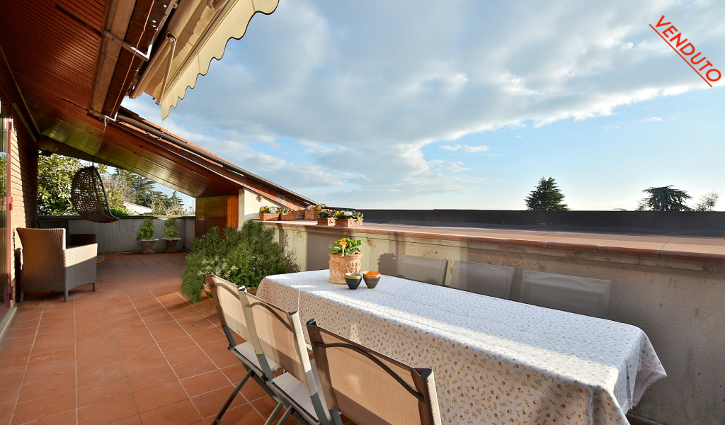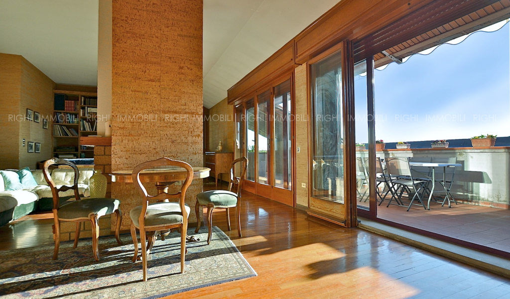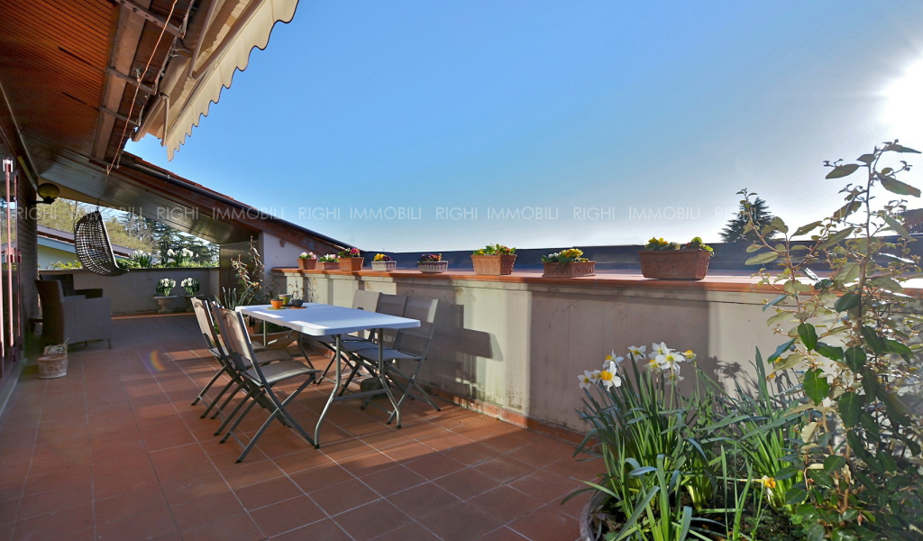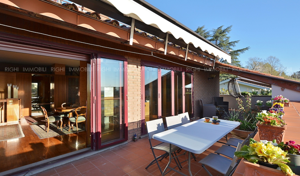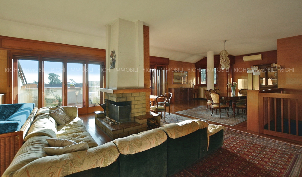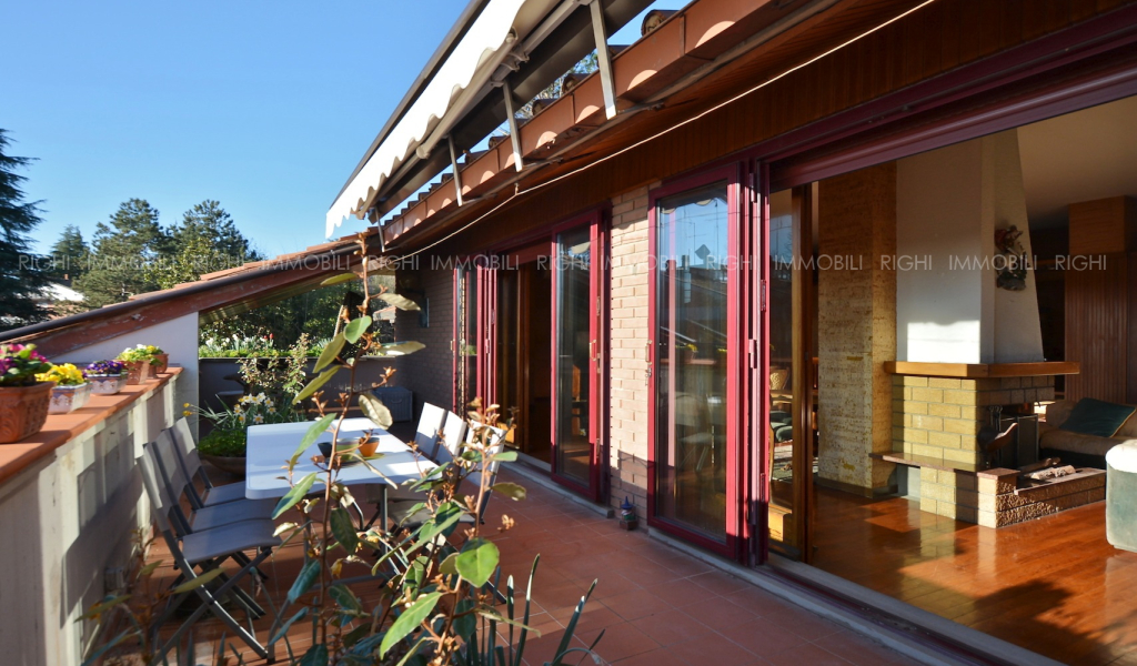 All’ultimo piano di signorile villa trifamiliare pietravista, sita in tranquilla posizione pedecollinare ma a poca distanza dai servizi di Via Toscana, elegante appartamento con terrazza abitabile, affacci panoramici ed immerso nel verde. L’unità immobiliare, con accesso indipendente ed esposta su quattro lati, si sviluppa sull’intero secondo piano con prestigioso salone doppio con camino centrale ed accesso alla terrazza, cucina abitabile, disimpegno arredabile, tre camere di cui una con cabina armadio, due bagni, lavanderia. Internamente collegata con l’appartamento, spaziosa mansarda con bagno e ripostiglio illuminata da ampi velux. Riscaldamento autonomo. Aria condizionata nel salone. Completano la proprietà garage doppio, ampia cantina ciclabile e ripostiglio. L’immobile, da rivedere internamente, consente una ottimale fruizione e personalizzazione degli spazi. E’ possibile realizzare una quarta camera ed un quarto bagno ed usufruire della predisposizione esistente per un secondo accesso. CL. F – EP. 254,51 kwh/mq/anno. € 850.000